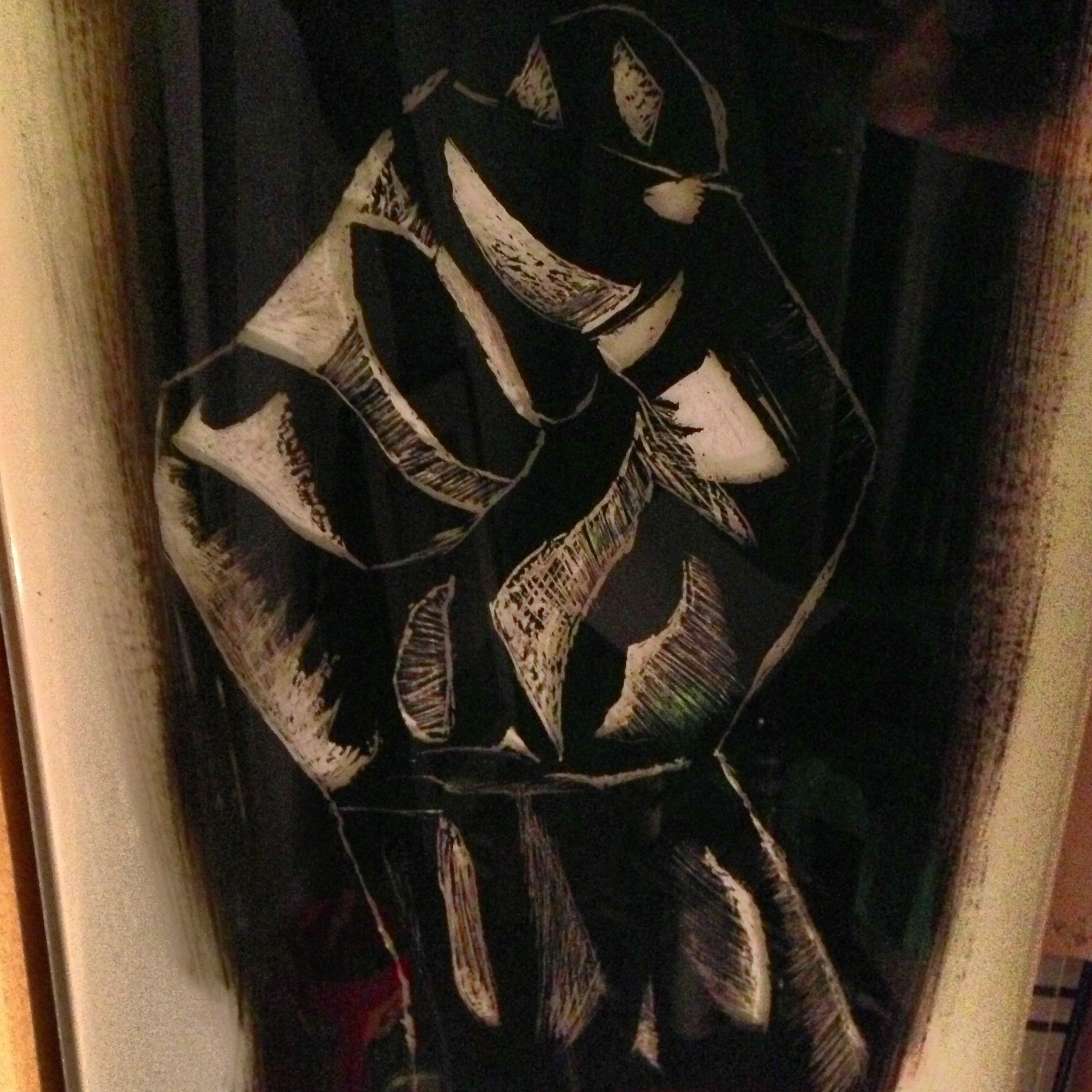 Added some depth and shading, and the smaller petals to fill in negative space. The backdrop is a mirror and the mixed media is translucent, giving it a variance as it goes towards the waterline, where its only lightly whitewashed.